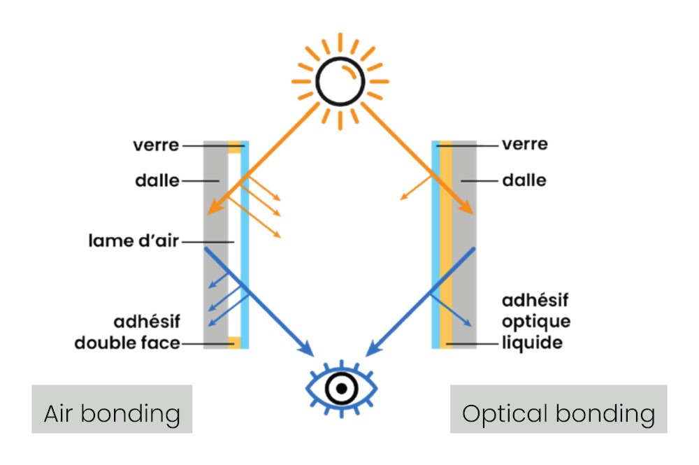 L'air bonding désigne une méthode d'assemblage des écrans dans laquelle un espace d'air est laissé entre le verre de protection et l'écran LCD. Cet espace peut provoquer des reflets, réduire la qualité de l'image et créer des problèmes de condensation.