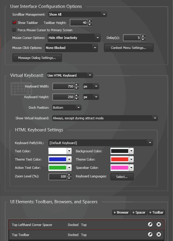 Dans cette section, vous trouverez des options pour personnaliser l’affichage et la navigation sur la borne. Les boutons « Navigateur », « Espacement » et « Barre d’outils » vous permettent d’ajouter et de configurer plusieurs éléments :
