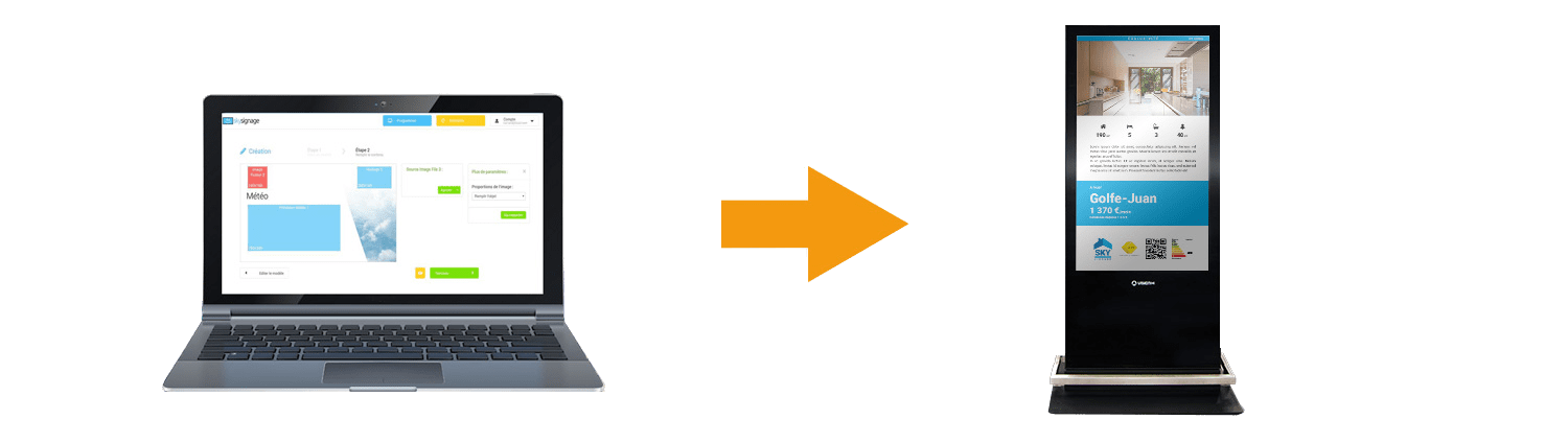 Avec notre widget intégré, il vous suffit de glisser-déposer les annonces immobilières dans la programmation pour qu’elles soient instantanément affichées sur vos supports d’affichage.