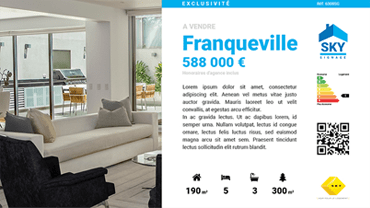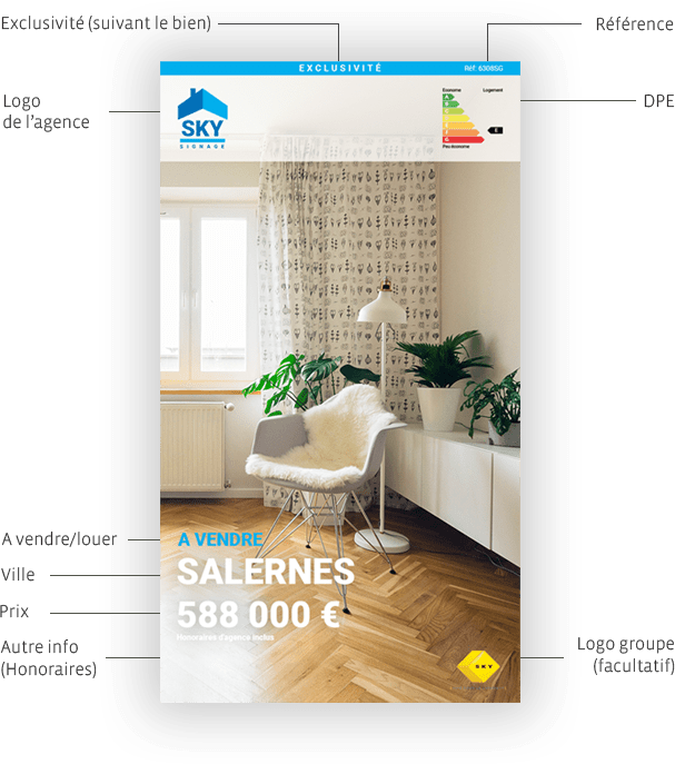Choisissez parmi plusieurs modèles d’affichage personnalisables en portrait ou en paysage, avec trois options de mise en page : Élégant, Idéal, et Absolu. Ces modèles s’adaptent à votre charte graphique et vous permettent de créer des annonces attractives en quelques clics.